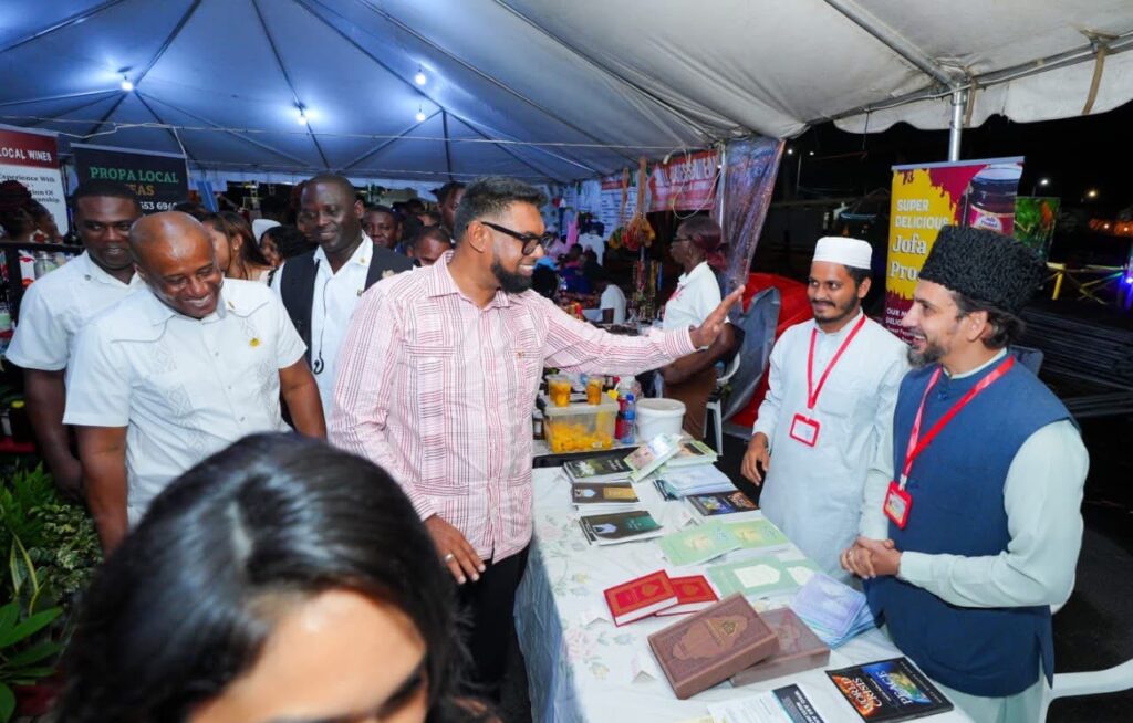 Several dignitaries visited the exhibition, including the President of Guyana, Dr. Mohamed Irfaan Ali, and the Vice President (and former President), Bharrat Jagdeo. A copy of “World Crisis and the Pathway to Peace” by Hazrat Khalifatul-Masih V (may Allah be his Helper) was presented to Mr. Jagdeo as a gift. The same book was gifted to Mr. Nazim Hussain, host at NCN National Television.