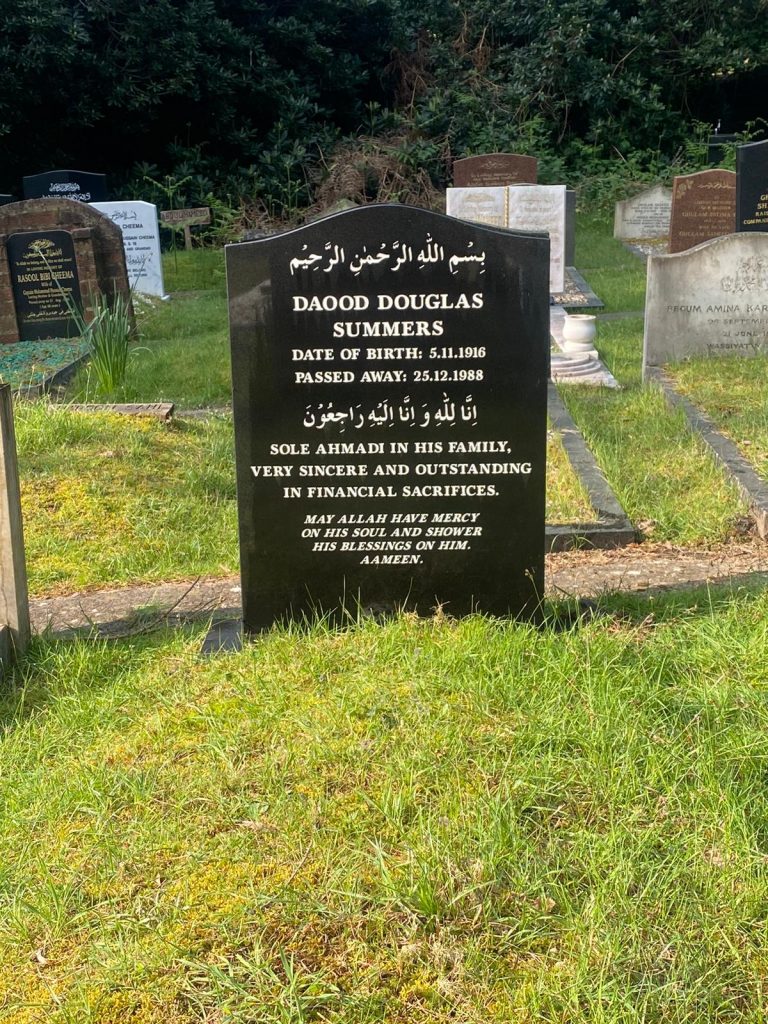 This brief article aims to honour the memory of a late English Ahmadi. When I arrived in the UK in 1983 as Imam of the Fazl Mosque London and the Missionary Incharge for the UK, I was introduced after some time to a very sincere English Ahmadi friend named Daood Douglas Summers. His date of birth was November 5, 1916, and he passed away on December 25, 1988, at nearly 72 years of age. He is buried in the Jama’at’s cemetery in Brookwood.